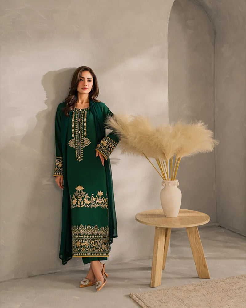 This 3-piece stitched, ready-to-wear set brings luxury to your wardrobe with delicate hand embellishment, premium...