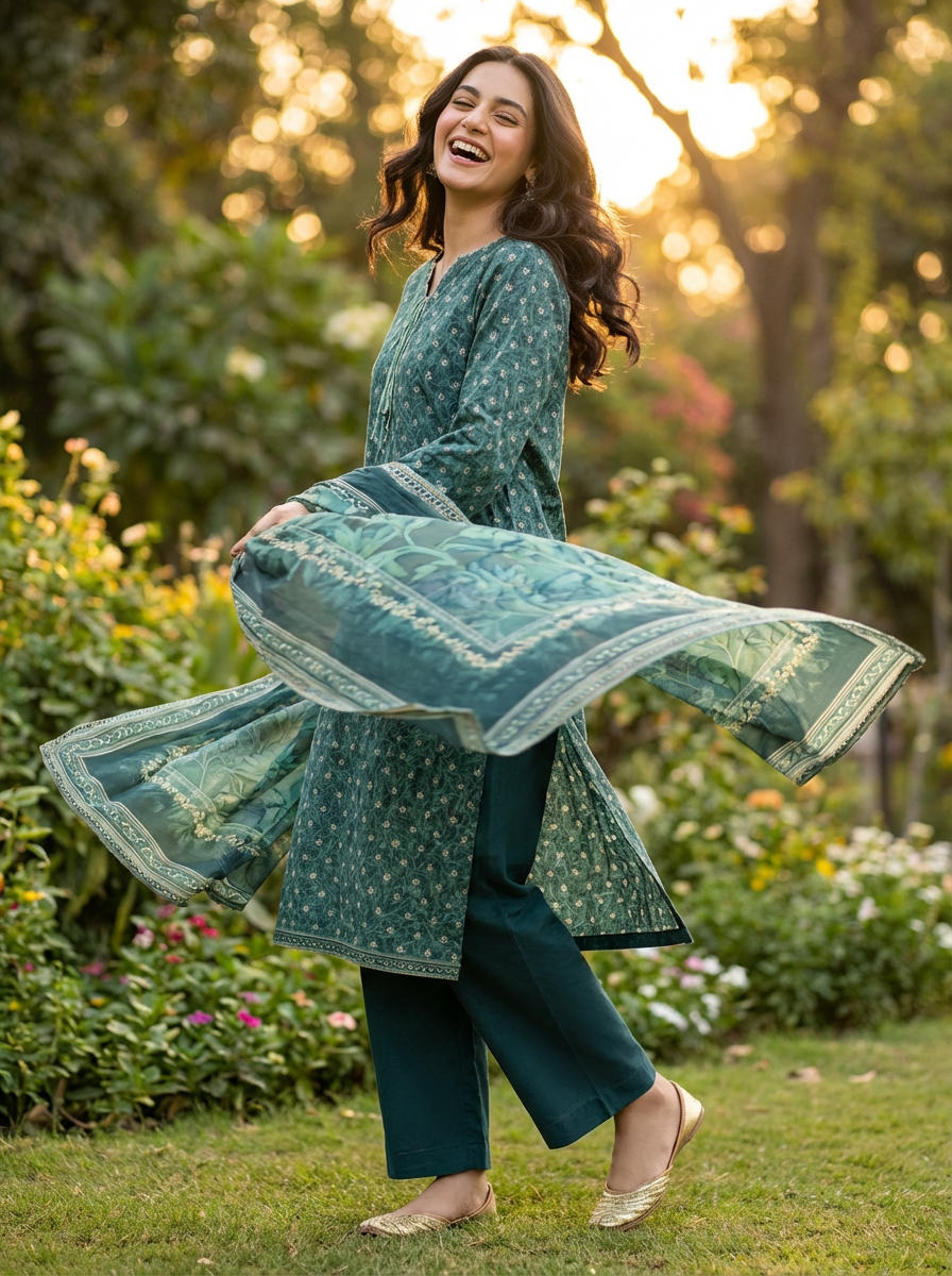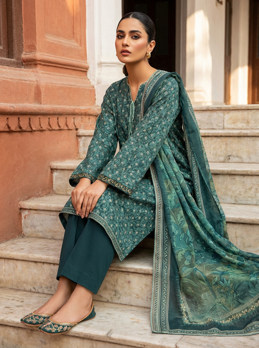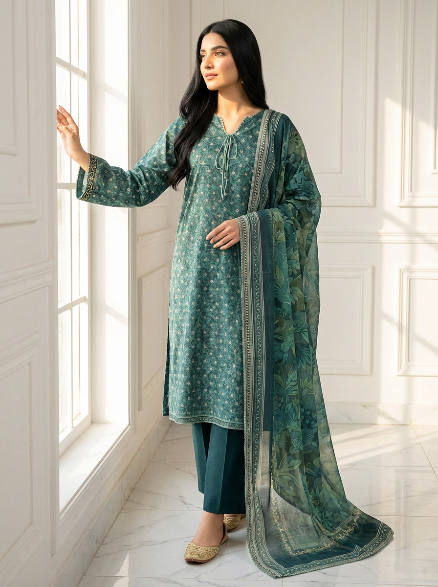 Refresh your seasonal wardrobe with this premium green printed lawn 3 piece unstitched suit, crafted for women who love lightweight, breathable & trendy summer outfits. Ideal for daily wear, casual meetups, and semi-formal gatherings, this suit blends soft lawn fabric with fresh prints for effortless elegance.
