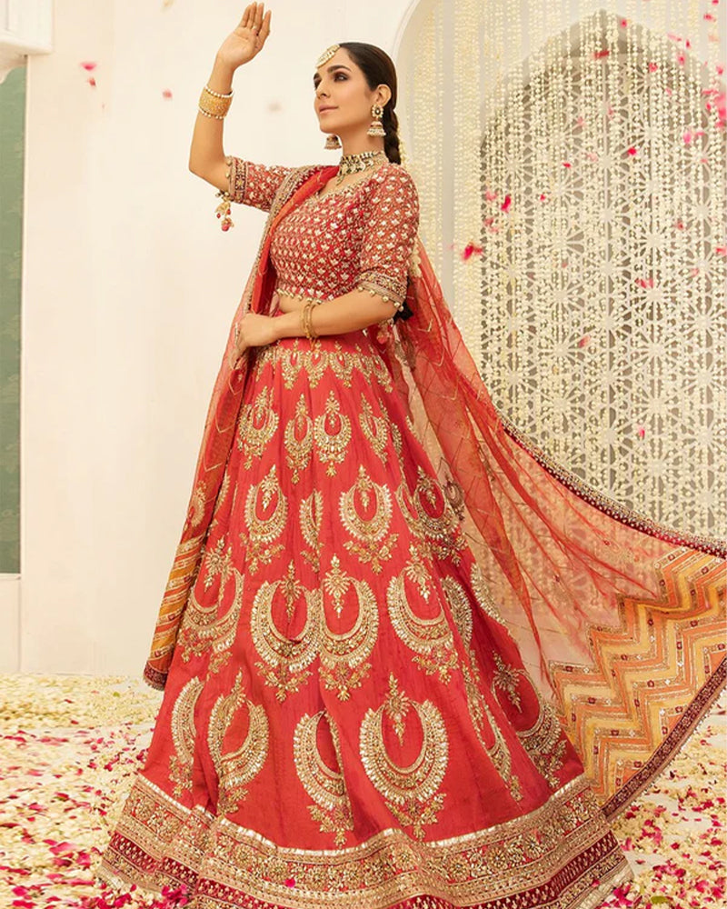 Exude timeless elegance with the Maria B Couture Collection in a stunning coral hue. This luxury 3 piece bridal ensemble is crafted from premium raw silk and pure organza, featuring delicate hand embellishment and intricate embroidery. Perfect for weddings, receptions, and grand festive occasions, this couture piece is designed for women who want to make a royal statement.
