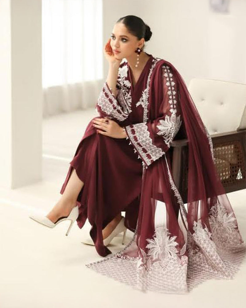 Front (Cationic Chiffon): Dyed chiffon with elegant embroidered neck patches