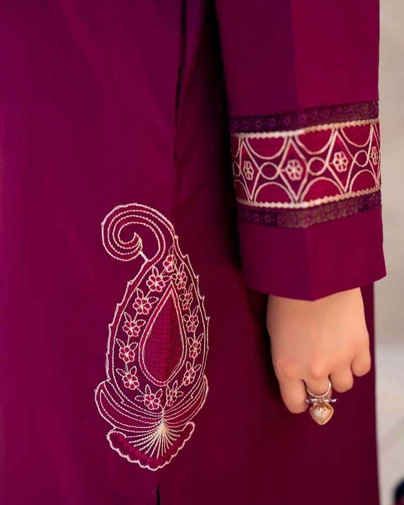 A rich plum ensemble that blends minimal elegance with refined threadwork. Soft, breathable cotton keeps you comfy all day, while the detailed sleeve cuffs and paisley-edged dupatta add a polished finish for lunches, meet-ups, or semi-formal evenings.
