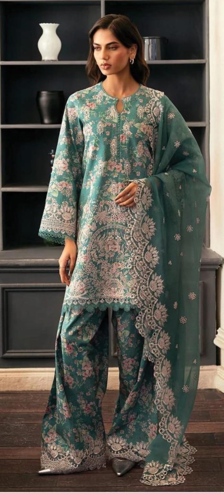 Seafoam Teal Muse is designed for women who love serene teal hues, delicate florals, and timeless chikankari elegance. Crafted in a refreshing seafoam teal palette, this ensemble blends soft floral prints with intricate embroidery, making it perfect for daytime gatherings, summer occasions, and graceful everyday wear.