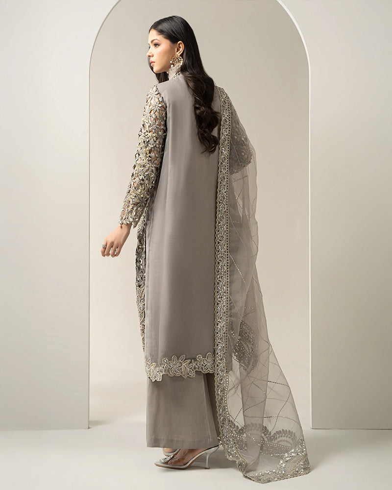 Bring luxury and elegance to your festive wardrobe with this sophisticated silver organza ensemble. Featuring intricate cutwork embroidery, embellished details, and a delicately embroidered dupatta, this outfit radiates timeless charm and modern grace. Ideal for weddings, parties, and formal soirées, it’s crafted for women who love refined sophistication.