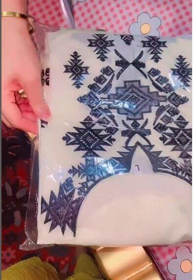 Shirt: Heavily embroidered organza with ornate front, sleeves, and borders